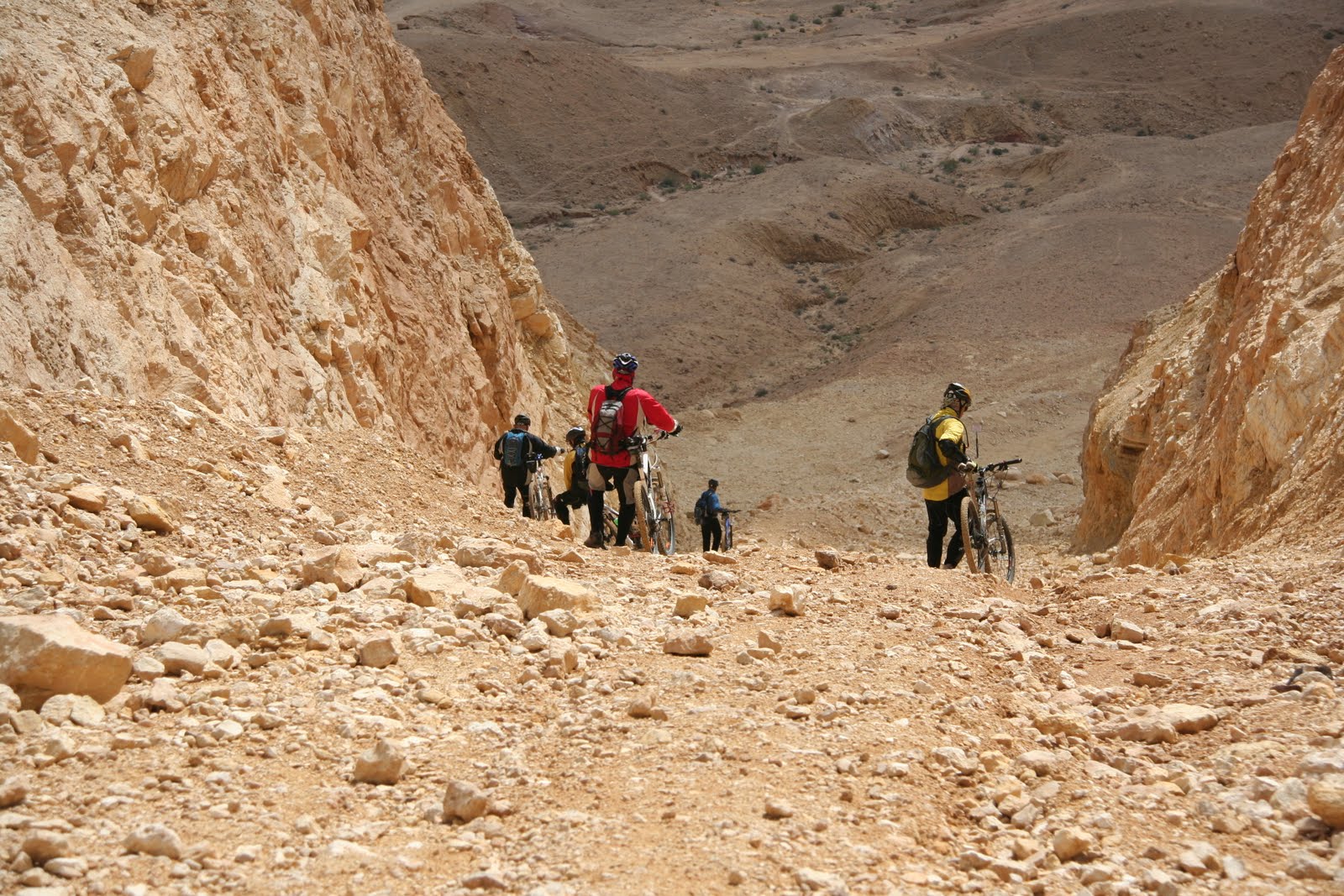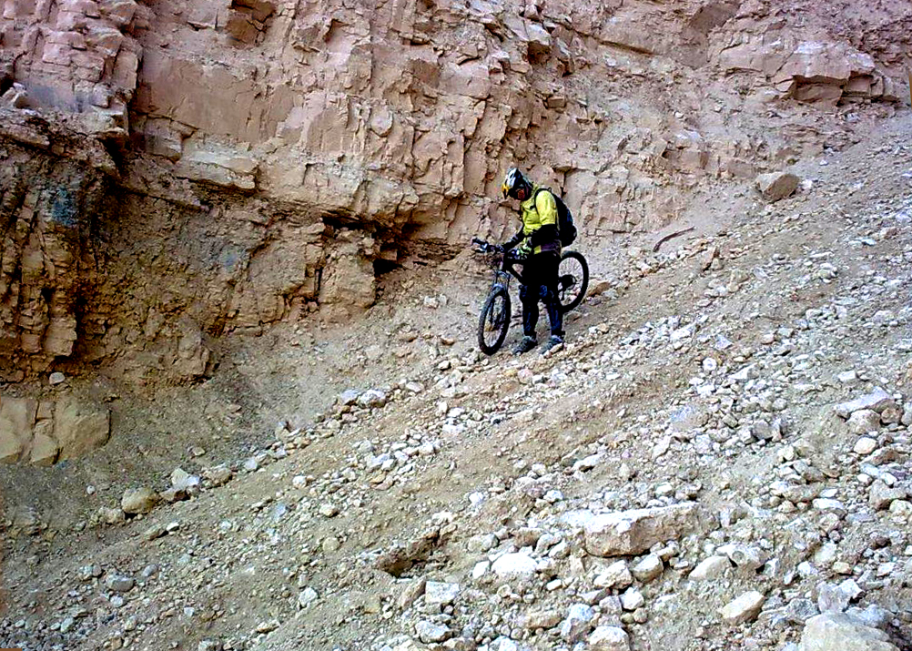 קשה להינתק מהנוף המדהים. הייתי יכול לשבת שם שעות לבהות במכתש, בצוקי הסלע האימתניים ולכתוב מהדורה מודרנית ל"אדם מחפש משמעות". אבל מישהו, בטח ספי כמו שאנחנו מכירים אותו, מזרז אותנו ויאללה ממשיכים. הדרך עוזבת את שפת המכתש וממשיכה בערוצו של נחל מחמל. כדרכן של דרכים בערוצי נחל, הצמחיה עשירה ואנחנו מדוושים בין חלוקי נחל וסלעים ובין שיחי רותם גדולים בשיא פריחתם מנצלים את הרגעים הרוגעים האחרונים של טרום-אדרנלין. בזמן שאנחנו נותנים קצת חמצן לנשמה ולנשימה, ספי, שסבתא שלי היתה אומרת שיש לו שפילקעס אין תוחעס, לא יושב בשקט ומקפץ על הגבעות כמו איזה מתנחל צעיר.