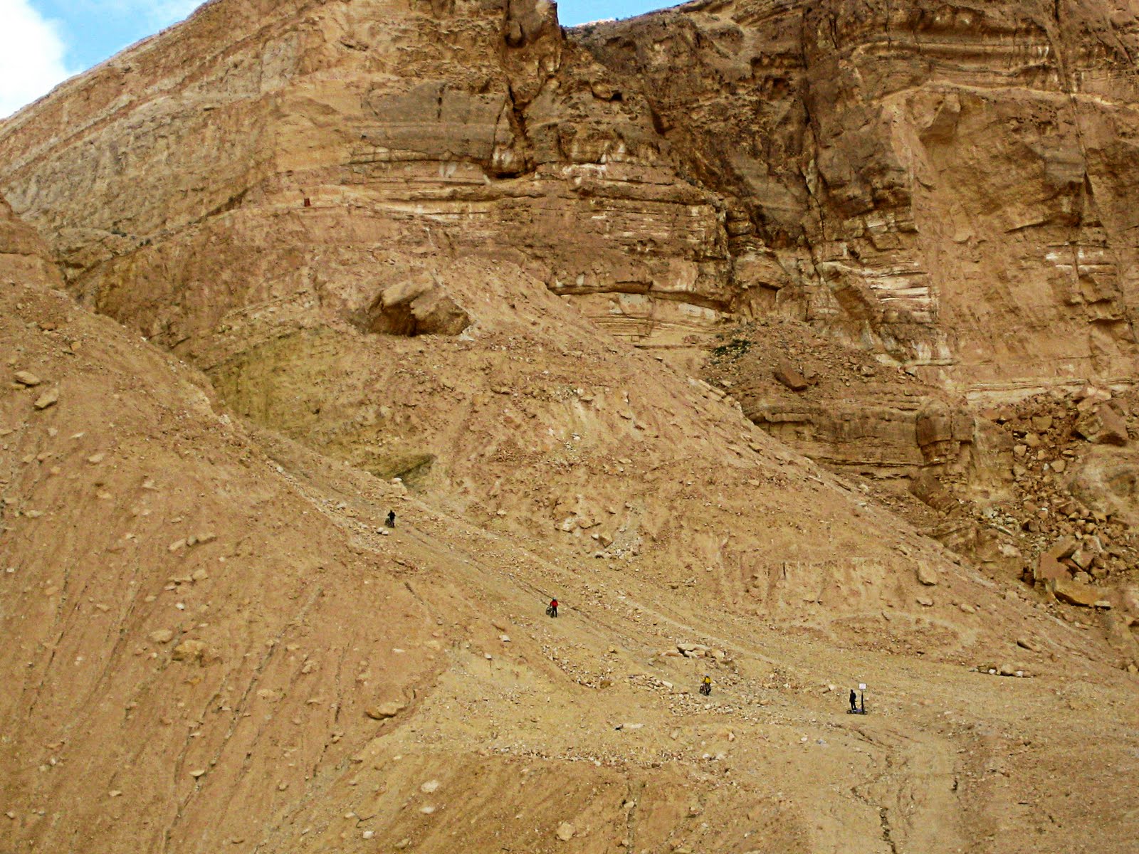 שני קירות זקופים חצובים בהר, וביניהם שביל דרדרתי תלול תלול היורד בקו ישר כמו סרגל עד לקרקעית המכתש. אנחנו מתפעלים מהעצמה ובזווית העין מחפשים (לשווא) את מצד מחמל השפוי יותר. ספי לא קרא כנראה את הכתבה הנ"ל ב"הארץ", ולא מודע לכך שאחרי 3-4 מטרים אין דרך חזרה. צעד אחד, שני צעדים וזהו. בלית ברירה הו אומר לנו שזה אפשרי ואפשר לרדת (רגלית כמובן, הס מלחשוב על ירידה רכובה), עופר מצטרף אליו ומתחיל לרדת ומכיוון שאין דרך חזרה, כולנו מצטרפים ואט אט, עקב בצד גלגל, צעד אחר צעד, מתחילים לרדת. גם זה לא קל, הירידה באמת תלולה. אתה עושה יותר משנים שלושה צעדים ברציפות ואתה מרגיש שעוד רגע לא תוכל לשלוט ומתחיל להבין מה זה טויוטה. אתה אוחז בכידון ומייצב את הגלגל הקדמי מקביל לציר הדרך, אך הגלגל האחורי, ברגע שסוטה מעט מקו הציר, הוא מתחיל בהידרדרות צידית ללא קשר למה שאתה מתכנן. שני המעצורים לחוצים עד סוף המהלך, והגלגלים הנעולים פשוט מחליקים במדרון הדרדרתי. אני, שנשארתי אחרון על מנת לצלם את הירידה, מביט למטה ורואה איך החברים הולכים וקטנים, הולכים ונעלמים, עופר ואביחי שרצו קדימה (רצו?... זחלו מהר!) כבר על ציר הנפט שבמכתש נראים כנקודות זעירת על השביל (בריבועים המודגשים בתמונה להלן – האם אתם מצליחים להבחין בהם?). וכשאתה מגיע למטה, מסתכל לאחור ורואה את הקבוצה היורדת אט אט על רקע המצוק, פתאום הביטוי "כחגבים היינו" מקבל משמעות חדשה ומוחשית.