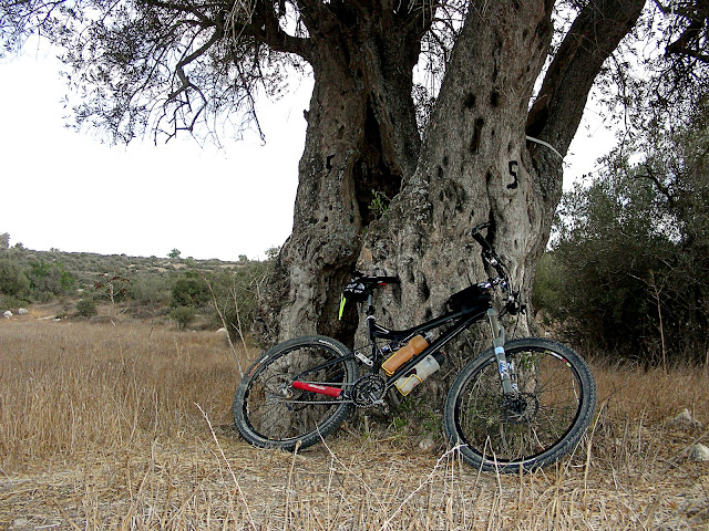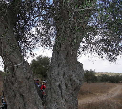 כמו עליסה, מרגע שהגיעה לארץ הפלאות כך אנחנו, מרגע שנכנסנו לתחום האסור, כאילו אנחנו רוכבים בארץ פלאות משלנו, ארץ בראשית. כמו לרכוב באתר צילומים של סרט תנכי. עמק רחב ידיים עם כרם זיתים ענק. עצי זית עם גזעים אדירים חרושי קמטים שנראה כי נטעו שם בראשית ימי הטורקים לפני מאות שנים, על הגבעות סביב תילי עתיקות מוקפים משוכות צבר ובוסתני פרי ובתוך כל הפסטורליה הזו אין אף אחד, לא רוכבי אופנים, לא ג'יפים, לא טרקטורונים, רק אנחנו עם עצמנו ועם עצי הזית.