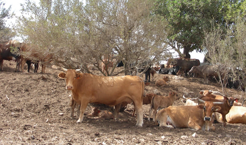 ממשיכים הלאה ומגיעים לעוד גדר, גדר בקר הפעם. לא מנעול ולא שלשלת, רק תיל דק מחזיק את השער. אנו חומקים פנימה ורוכבים על קרקע "דשנה" המעידה כאלף עדים כי זהו שטח ריכוז עדרי בקר. ואז הם נגלו לעינינו, עדר של עשרות אנטרקוטים רובצים בצל העצים ואנחנו, שבקטע הדשן הזה העדפנו לצעוד רגלית, פוזלים בעין אחת על האנטרקוטים התוקעים בנו מבט סקרני, מקווים שלא יעלה ברצונו של מי מהם לבדוק מקרוב מי הם האורחים הלא צפויים ובעין השניה סוקרים טוב טוב את הקרקע שלא נדרוך רחמנא ליצלן על מה שלא צריך. ורק לאחר שיצאנו מהשטח, כשאנו שוב מחוץ לגדר המכלאה, קראנו לעברם באומץ – להתראות בצלחת!